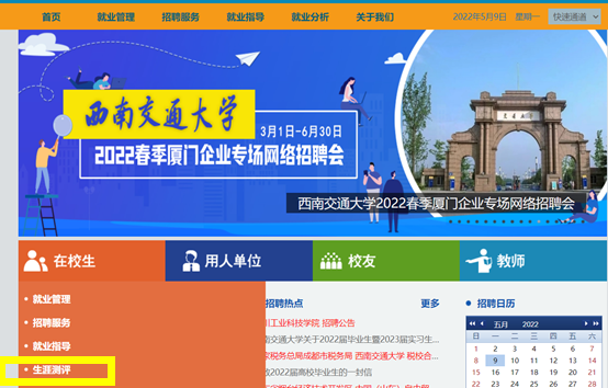 (https://jiuye.swjtu.edu.cn/eweb/jygl/index.so)点击“在校生-生涯测评”模块: