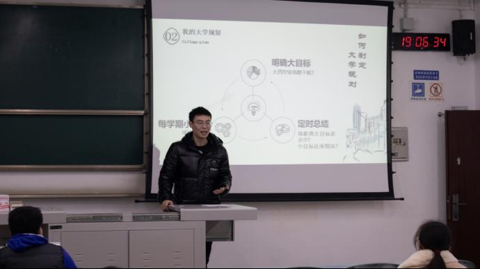 朱晨杰开篇便向同学们提出一个问题,“如果以‘我的大学生活’为题,写一篇作文,你会怎么写?”围绕着这个问题,他以自我介绍,学习之旅,干部经历,生活爱好,感悟总结五个模块来讲述自己会怎么写“我的大学生活”。在课程学习上,他主要强调了笔记、及时总结反思和自主学习的必要性,鼓励同学不要懈怠,抓紧时间提升自我。此外,他在课外竞赛和科研训练方面也结合自身经历给出了独到意见。丰富的干部经历不仅增强了他的责任心,也提高他的沟通交流能力和组织协调能力。他还鼓励同学们去培养更多元、更开放、更有益身心的兴趣,不要沉迷于游戏和追剧。最后,他总结到,有自己的定位,有时间的管理,有自学的能力才是当代青年人迈向成功的必由之路。