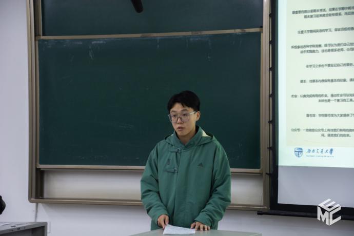 林雨眠首先向同学们展示了自己在三年来所取得的一些成绩。在这之后,他向同学们分享了自身的经验,包括明确自己的目标,做到上课认真听讲、作业独立完成、期末考前冲刺等。同时,他也向同学们分享了竞赛方面的经验。他建议,同学们应该从简单的比赛入手,多与指导老师沟通,找到靠谱的队友,利用网络资源自学相关知识,同时做好占用大量课余时间的心理准备。在最后,他向同学们分享了有关科创的经验。他表示,同学们应该尽可能早的参与到科创项目中去,多读论文,写学习报告,练习写作论文,和老师、学长学姐沟通,早日积累科创经验。