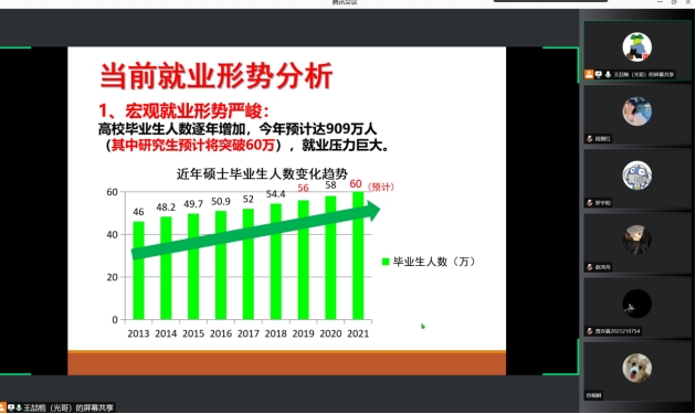 2021年12月1日晚19:30分,我院举办2021级研究生职业规划讲座,讲座通过腾讯会议平台线上方式举办,2021级硕士生辅导员王喆桅主讲,300余名硕士生同学通过电脑或手机终端收看讲座。