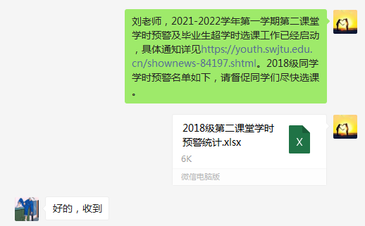 自2021年9月22日校团委发布《关于做好2021-2022学年第二课堂学时预警及毕业生超学时选课工作的通知》以来,我院团委严格按照通知要求完成了预警通知、预警帮扶以及超学时选课等工作。通过专项老师与年级辅导员对接、QQ群公告、年级大会、学生骨干培训会等途径强调第二课堂学时重要性,并指定各班班长、团支书重点帮扶第二课堂学时预警学生,要求确保本科2018级学生在本学期内达到第二课堂学时的毕业要求,要求确保本科2019级、2020级在本学期内消除学时预警。