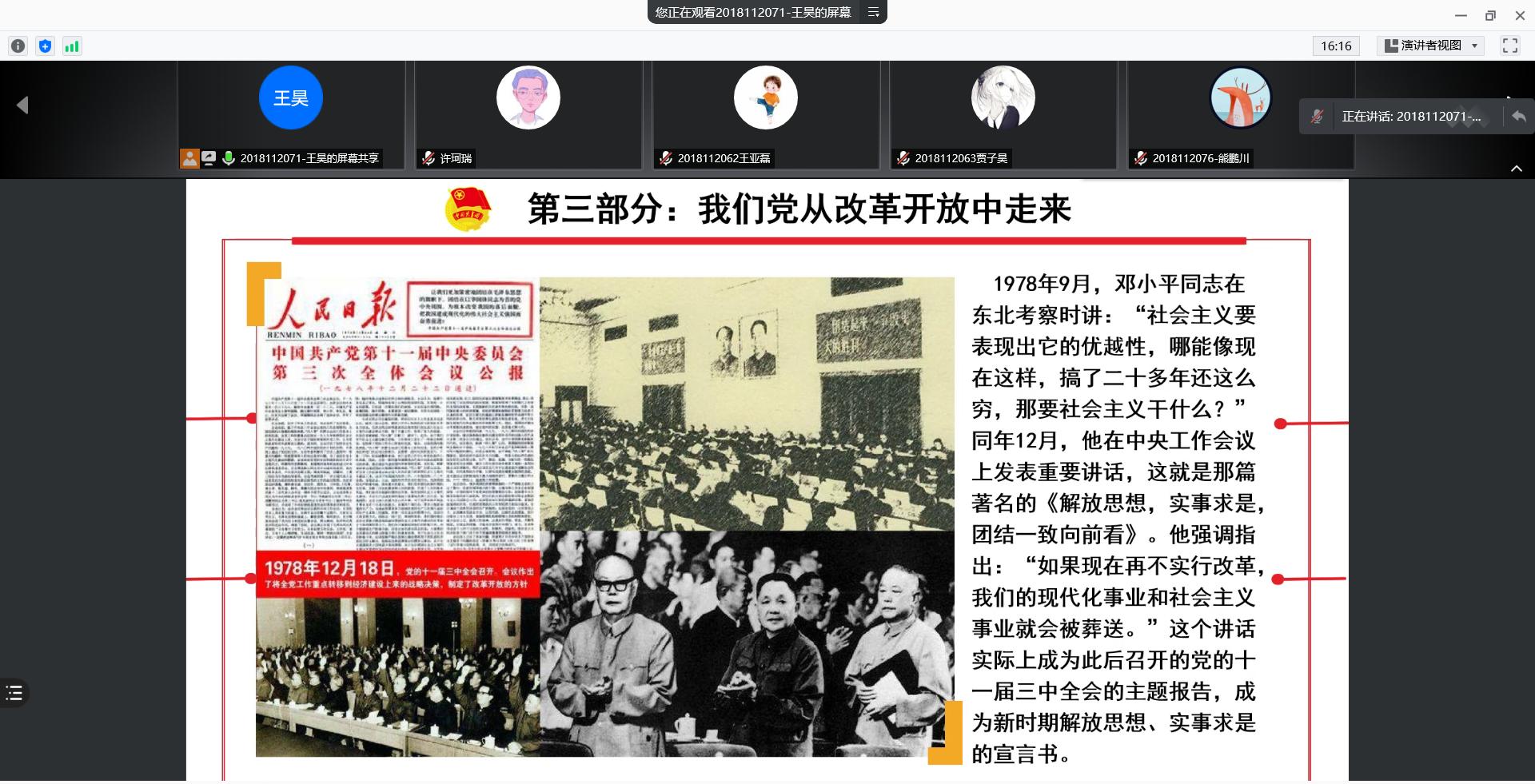 电气2018级4班团支部在支部书记王昊的带领下,共同观看视频《永葆初心:习近平总书记讲述百年征程》了解中国共产党百年奋斗历程。之后团支书分为四个部分分别为同学们讲解了每个时期共产党的光辉岁月。