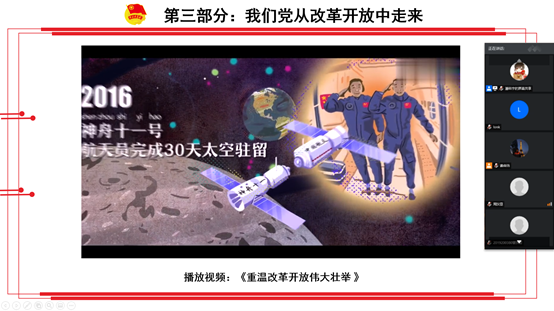 在专题学习会中,全体同学共同观看了《永葆初心:习近平总书记讲述百年征程》和《党的十八大以来的历史性成就和历史性变革》。回顾党的历史,艰难困苦,玉汝于成。我们从站起来、富起来,再到今天,终于踏上强起来的新征程。正所谓“数风流人物,还看今朝”,先辈们在战争年代、困难时期艰苦奋斗传承下来的革命精神,始终激励着一代又一代接班人奋力前行。