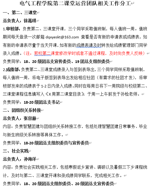 在本次会议中,郭冰倩老师对学院团总支在接下来三个月的工作进行了安排部署,2018级团总支书记徐嘉琪对我院第二课堂运营学生团队相关工作的具体分工进行了详细讲解,并对新加入团总支的同学进行了第二课堂运营业务和技术上的培训。