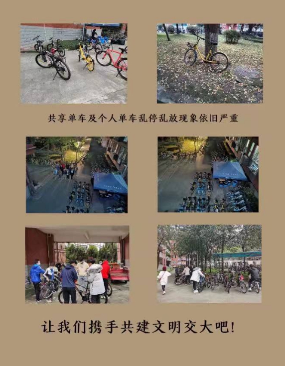 下午6时,志愿者们开展规范单车停放活动。学校内共享单车乱停乱放问题较为突出,志愿者们自发地将宿舍楼周边及消防通道口堵塞的车辆疏通。经过一个多小时的努力原本拥堵的道路变得宽敞起来。同学们的汗水挥洒在交大的土地上,大家的实际行动是对交大最浪漫的表白。与此同时,另一队志愿者们在食堂门口和宿舍楼进行“共享单车,共享文明”宣传活动,呼吁同学们规范单车摆放,文明出行。