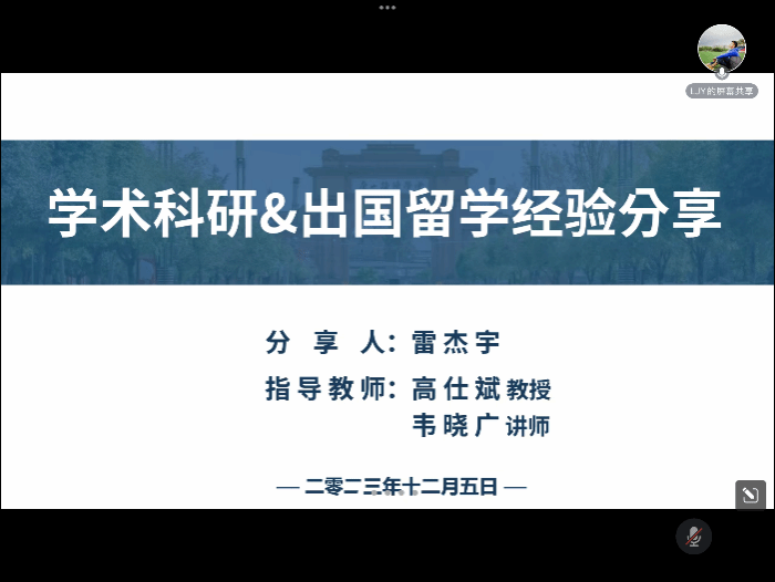 全球一体化作为当代社会的发展趋势,博士研究生应当立足中国、放眼世界,将科研论文写在祖国大地上。为帮助同学们提高英语应用水平和表现力,拓宽班级成员国际视野,12月5日晚19:30,我院2023级博士班在线上开展了“学术科研&出国留学经验分享”专题讲座。本次讲座特别邀请到新利体育2020级博士研究生、雅典国家技术大学电气与计算机学院联合培养博士雷杰宇主讲,辅导员沙静馨和2023级博士班全体成员共同参与。