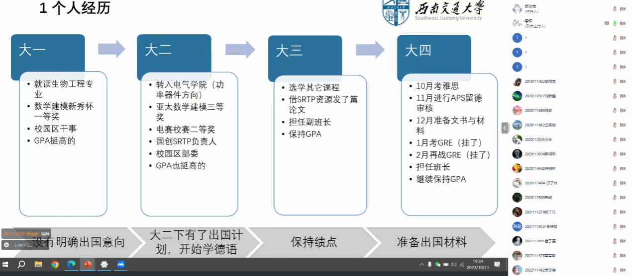 为帮助同学们了解出国留学形势与现状、解决出国留学的迷茫与困惑,10月11日晚19时,我院在线上开展EE专业留学申请准备与经验分享会。此次分享会邀请到学院2022届电气工程及其自动化专业的李栋同学就留学规划、留学申请和语言准备相关经验进行分享。此次活动旨在为学生提供更多关于留学申请的指导,同时为有意向赴海外深造的同学们提供宝贵的经验分享平台。