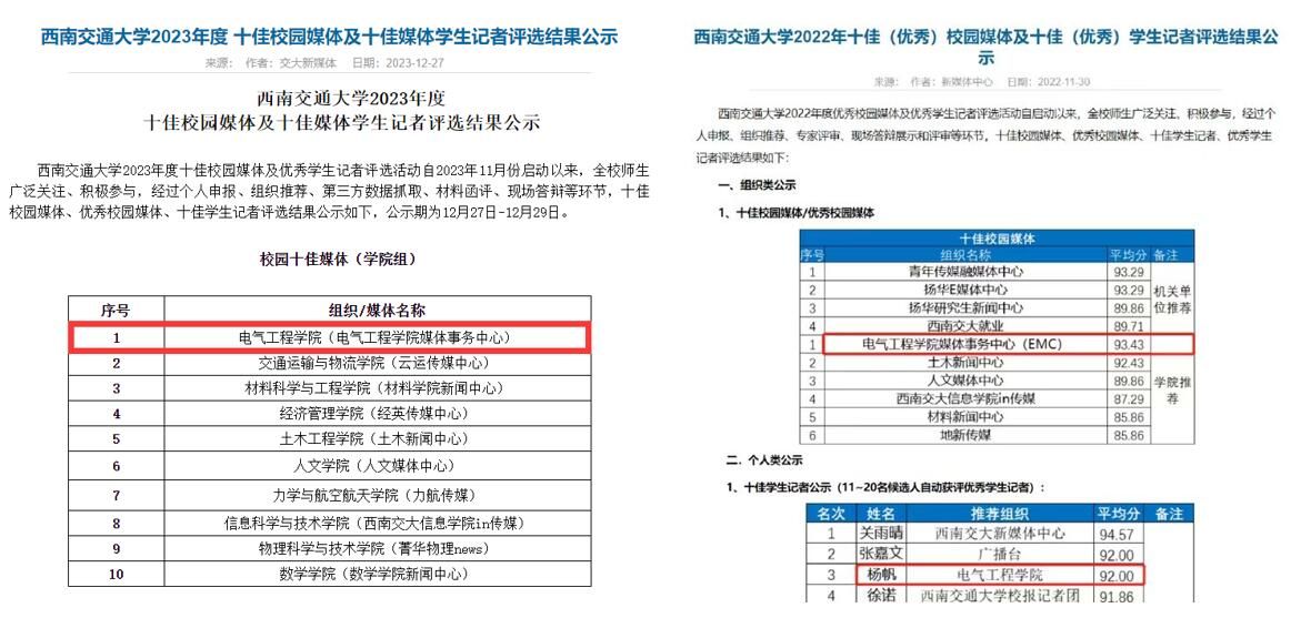 我院坚持落实“立德树人”根本任务,牢牢把握“围绕中心,服务大局”的宗旨,进一步加强新利体育官网信息宣传工作的组织领导和有效管理。学院健全新闻宣传工作机制,培养了一批新闻宣传学生骨干,2004年成立《电气人》编辑部,2007年,编辑部正式更名为我院媒体事务中心(EMC),该组织多次获评西南交通大学“十佳校园媒体”,其中,2022年度、2023年度连续两年以全校第一的成绩获评“十佳”。