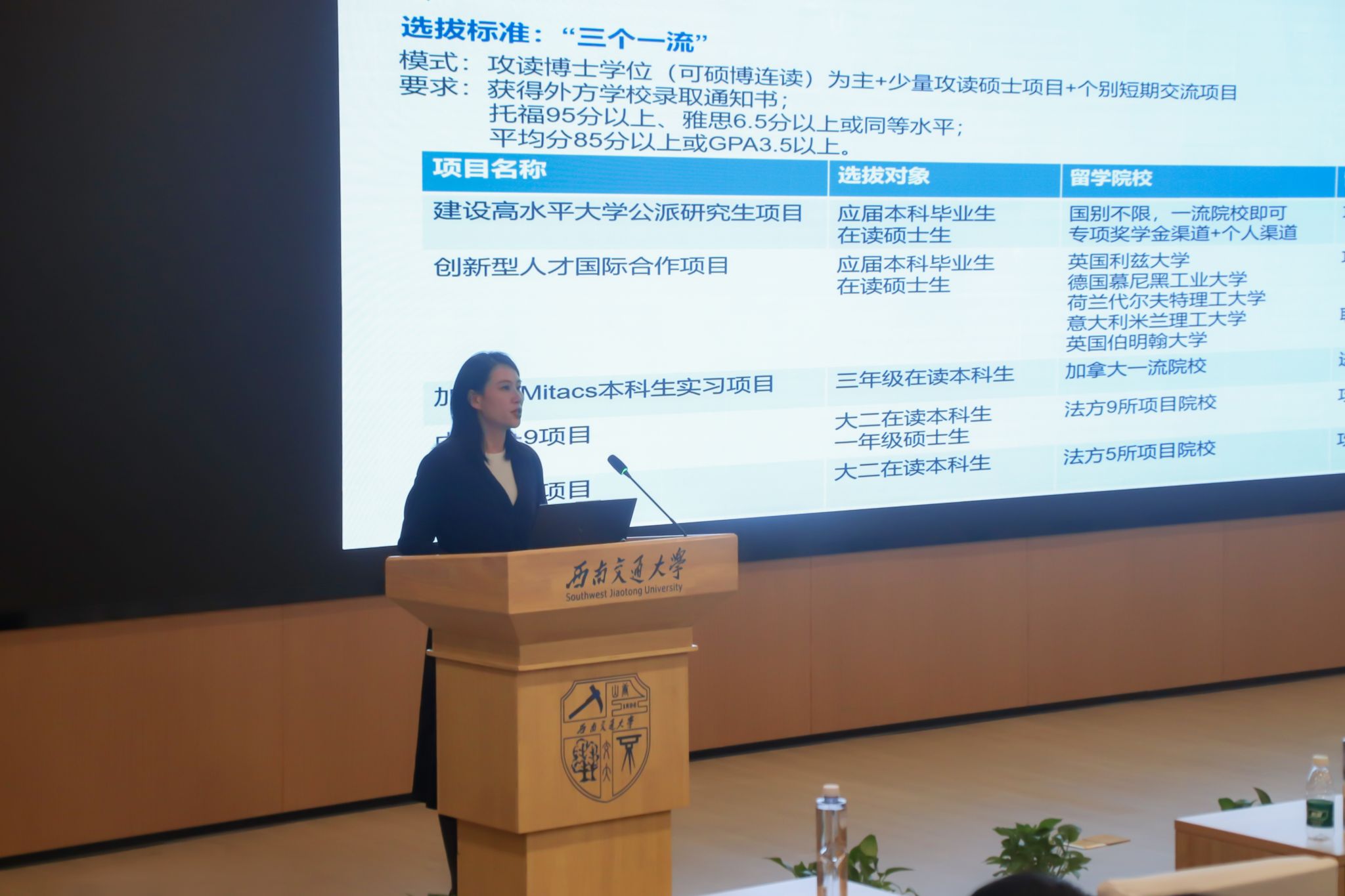 首先,廖莉副处长、杨帆主任针对新形势下学生的全球胜任力培养方式,从基本情况、政策解读、参与渠道与留学准备等方面为同学们进行了深入的剖析。老师们分析了历年的考研数据,引出西南交通大学出国(境)交流的基本情况,并分析学生在海外留学深造过程中的特点和思维误区。老师们还重点介绍了学校国际交流的相关政策以及交流和游学项目,并向同学们讲述了出国留学的规划方法和前期准备。