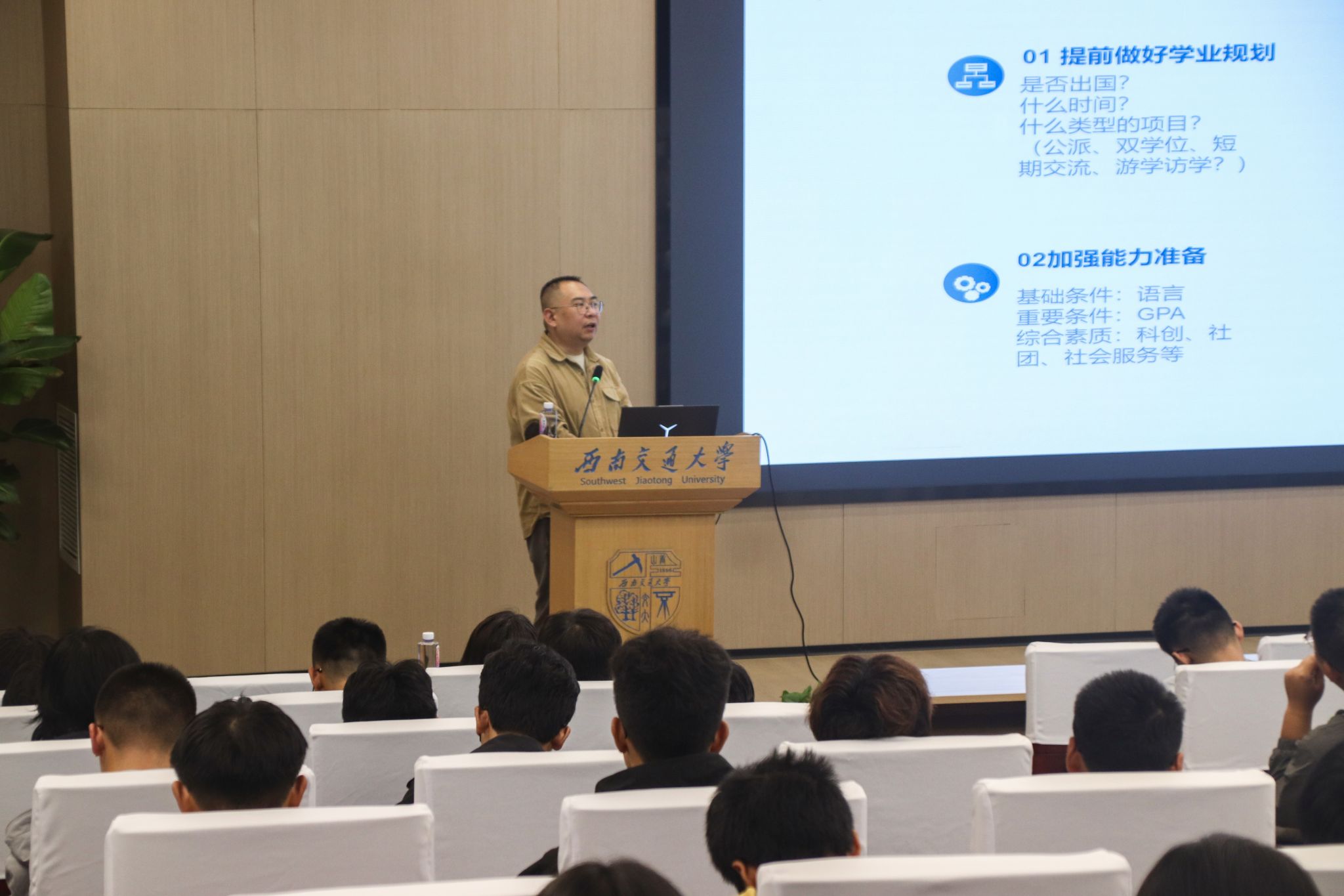 为助力学生拓宽国际视野,提升跨文化交际和生涯规划能力,2024年10月9日晚19时,我院本科2024级在犀浦校区图书馆一号、二号报告厅开展国际化视野与出国升学深造专题讲座。主讲人为西南交通大学国际合作与交流处副处长廖莉,出国(境)管理服务办公室主任杨帆,新东方前途出国留学规划师胡雪、唐溯阳。学院本科2024级辅导员及全体新生共同参加。