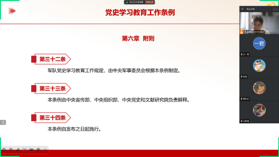 为深入贯彻落实《党史学习教育工作条例》(以下简称《条例》),推动党史学习教育常态化、长效化,2024年3月6日,我院研究生会组织开展了《党史学习教育工作条例》专题学习活动。本次活动由研会学术部副部长张桐源主讲,研究生会全体成员参加。