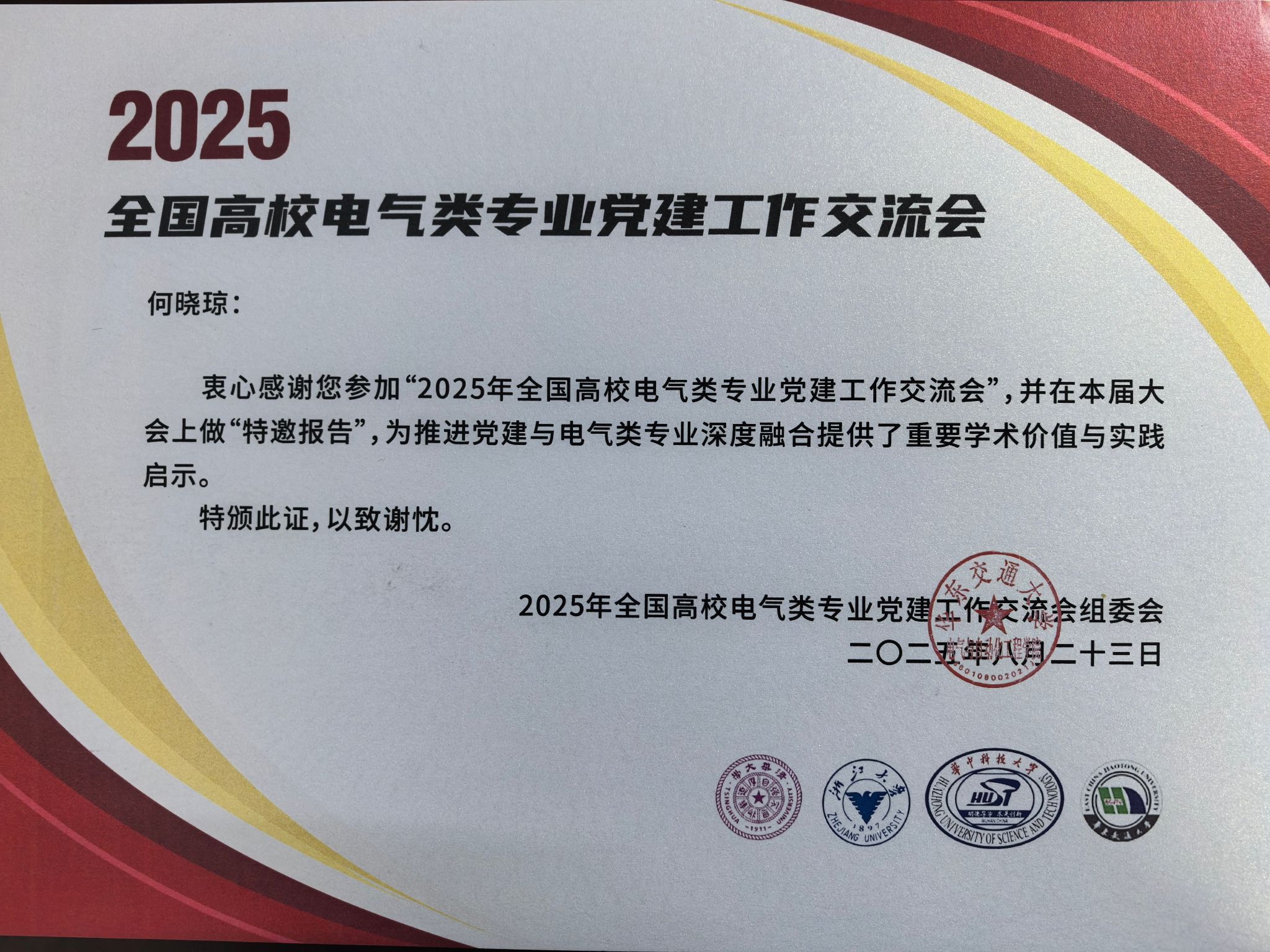 2025年8月23-24日,全国高校电气类党建双创协同平台成立大会暨电气专业党支部书记双带头人能力提升论坛在江西南昌召开。国家轨道交通电气化与自动化工程技术研究中心党支部书记何晓琼受邀参会,并做大会特邀报告。我院党委副书记王轶、电力工程系教师党支部书记刘炜同时参会。