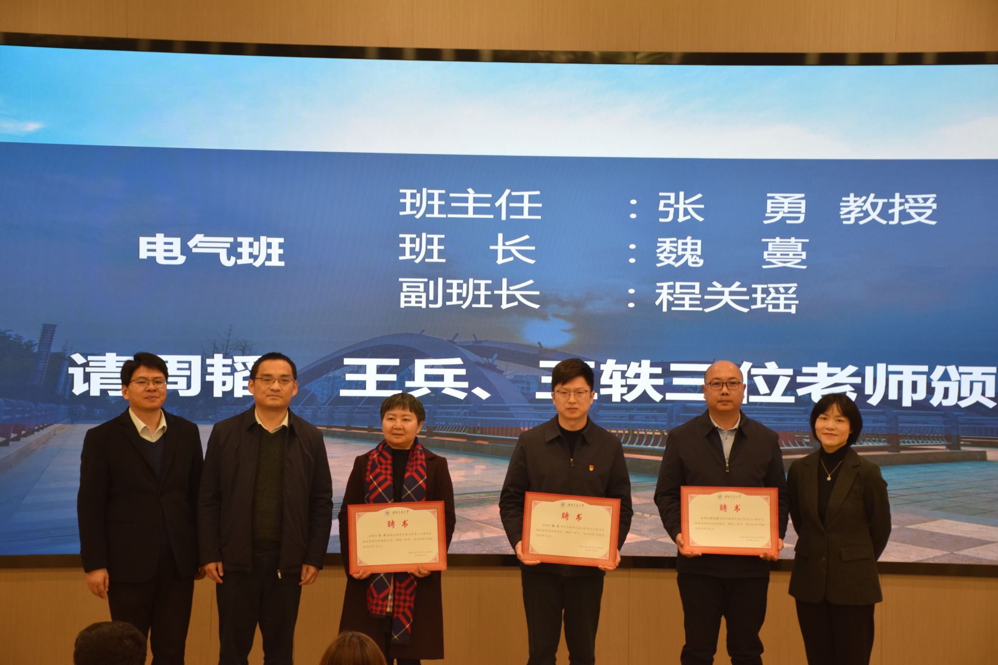 随后,会议进行了班主任、班委聘书颁发仪式。周韬副部长、王兵副处长、王轶副书记为电气班的班主任张勇教授、班长魏蔓、副班长程光瑶颁发聘书;周韬副部长、王兵副处长、沙晓雪副书记为机械班班主任周瑾老师、班长曾娅、副班长周兴颁发聘书。
