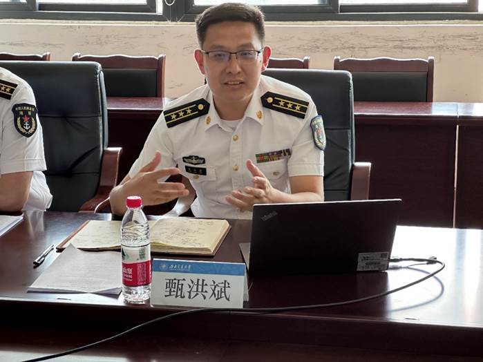 甄洪斌主任从专业建设历程、学科建设、培训体系、科研项目、设施配套、重点实验室等方面介绍海军工程大学我院。甄洪斌主任希望通过此次交流加强与我院的合作,共同促进学科和专业的建设发展。