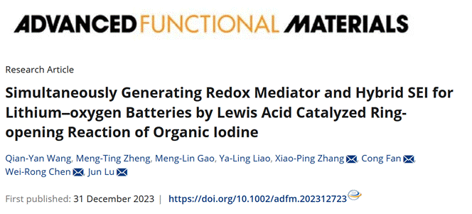 近日,学校我院陈维荣教授团队张晓平副教授等人在锂氧气电池负极保护和能量利用效率提升领域取得重要进展,相关研究成果以我校为第一单位,以“Simultaneously Generating Redox Mediator and Hybrid SEI for Lithium–oxygen Batteries by Lewis Acid Catalyzed Ring‐opening Reaction of Organic Iodine”为题,发表在国际知名期刊《Advanced Functional Materials》(中科院一区Top期刊,IF=19)上。西南交通大学为论文第一单位,我院张晓平副教授、电子科技大学樊聪副教授、我院陈维荣教授和浙江大学陆俊教授为该论文通讯作者。