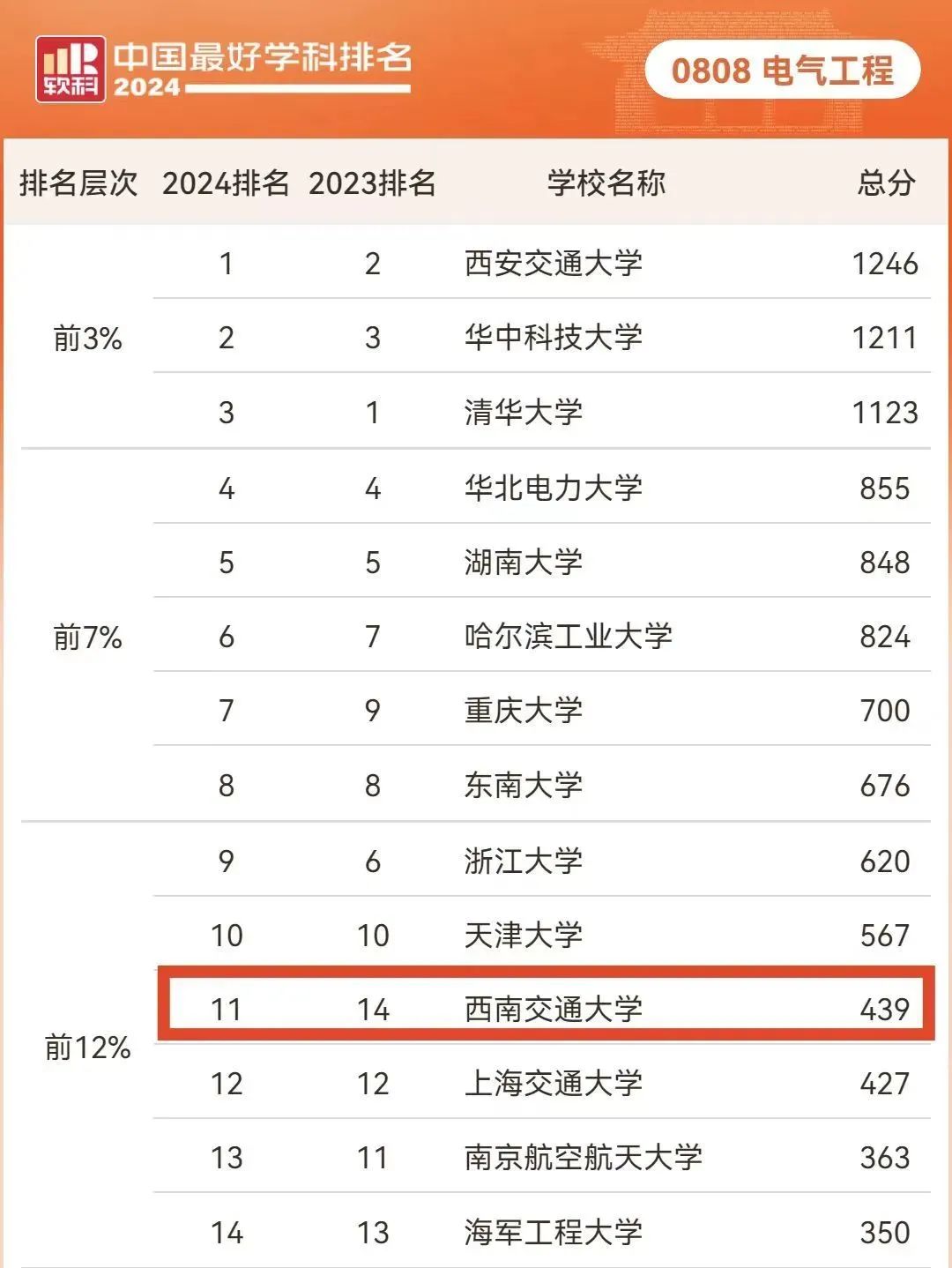 近期公布的2024软科中国最好学科——电气工程学科排名中,我校位列前12%: