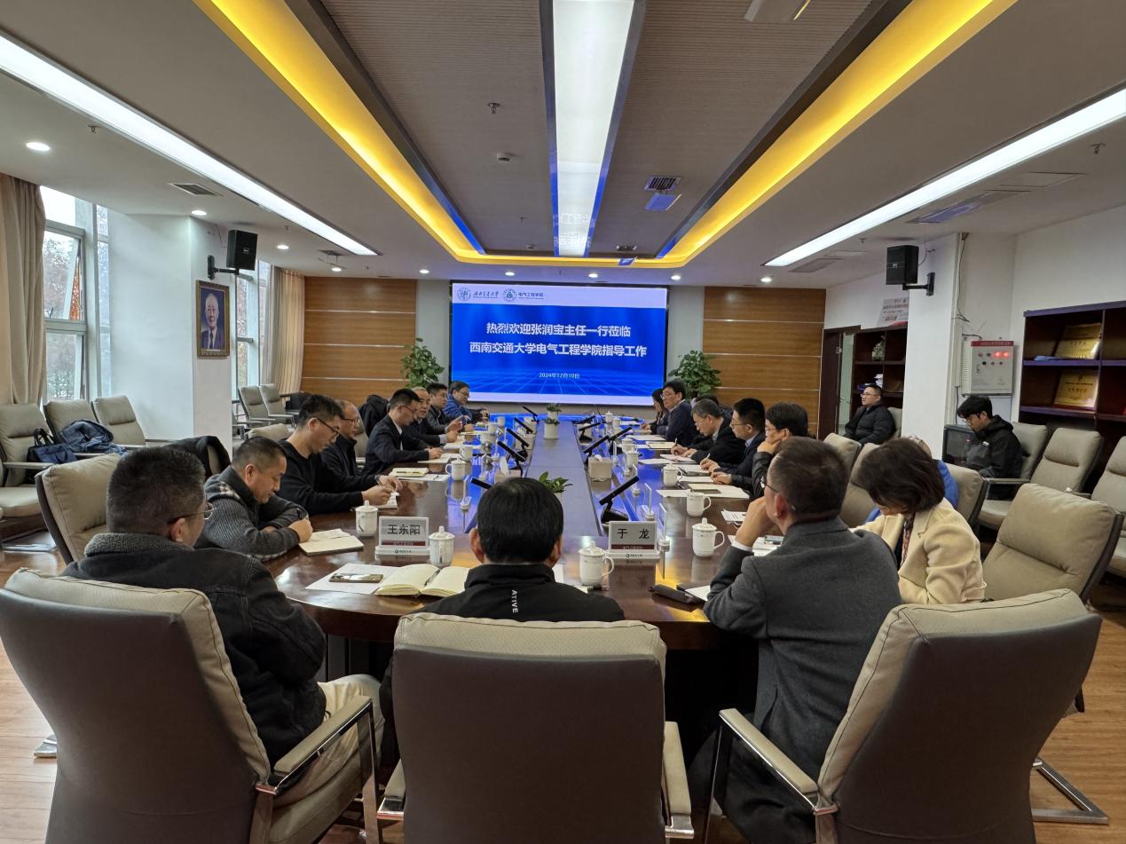 12月10日下午,国铁集团工电部副主任张润宝一行莅临我院开展交流研讨会。国铁集团工电部主办乔凯庆,中国铁设电化电信院院长罗健,成都铁路局供电处副处长何祥照,中铁二院电化院总工程师邓云川,中国铁设电化电信院电气化所副所长魏建忠;我院院长马光同,党委书记王斌,国家轨道交通电气化与自动化工程技术研究中心主任高仕斌,继续教育学院院长陈民武,我院副院长何晓琼、刘志刚,以及学院教师代表参加交流研讨会议。会议由马光同院长主持。