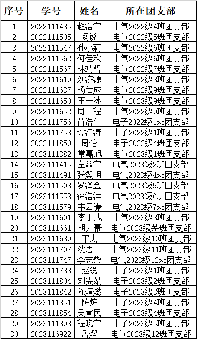 根据学校关于发展团员工作的相关通知要求,参照《中国共产主义青年团章程》《中国共产主义青年团发展团员工作细则》,经本人申请、团支部讨论同意确定及学院团委预审,拟确定以下30名同学为团员发展对象,现将名单予以公示。